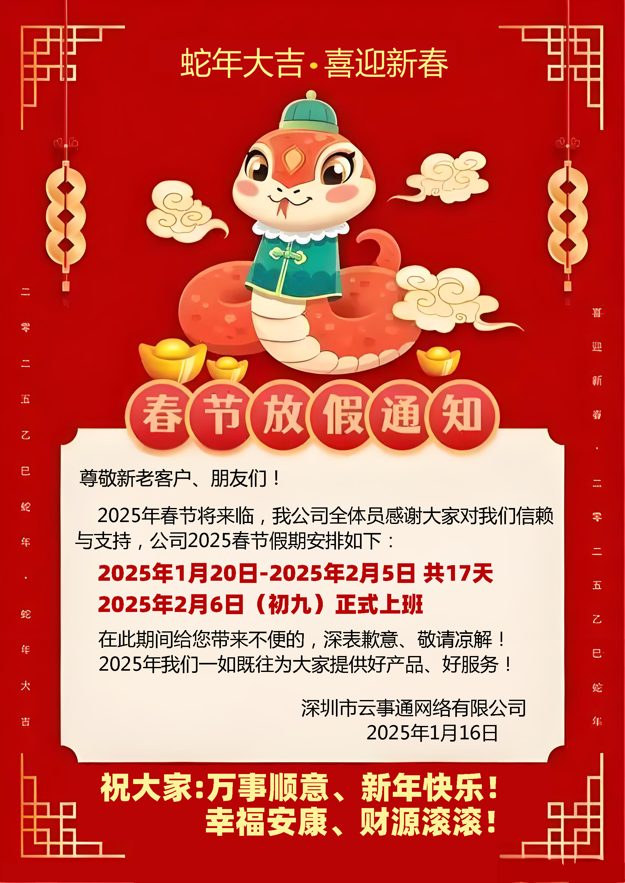 2025年春節即將來臨,我公司全體員感謝大家對我們信賴與支持,深圳監控安裝公司2025春節假期安排如下:
